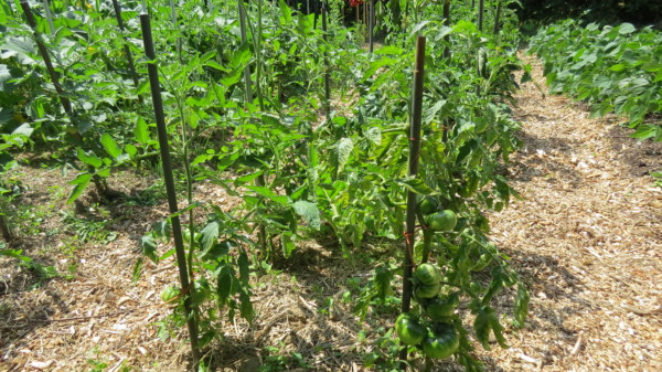 Comme vous pouvez le constater sur les images, on retrouve cet aspect chétif aux feuilles jaunies. Les photos suivantes ont été prises sur le même site à la différence près que des tontes de gazon (riches en azote) ont été utilisées comme paillis en plus du BRF. Ce paillis avait été déposé l’année dernière.